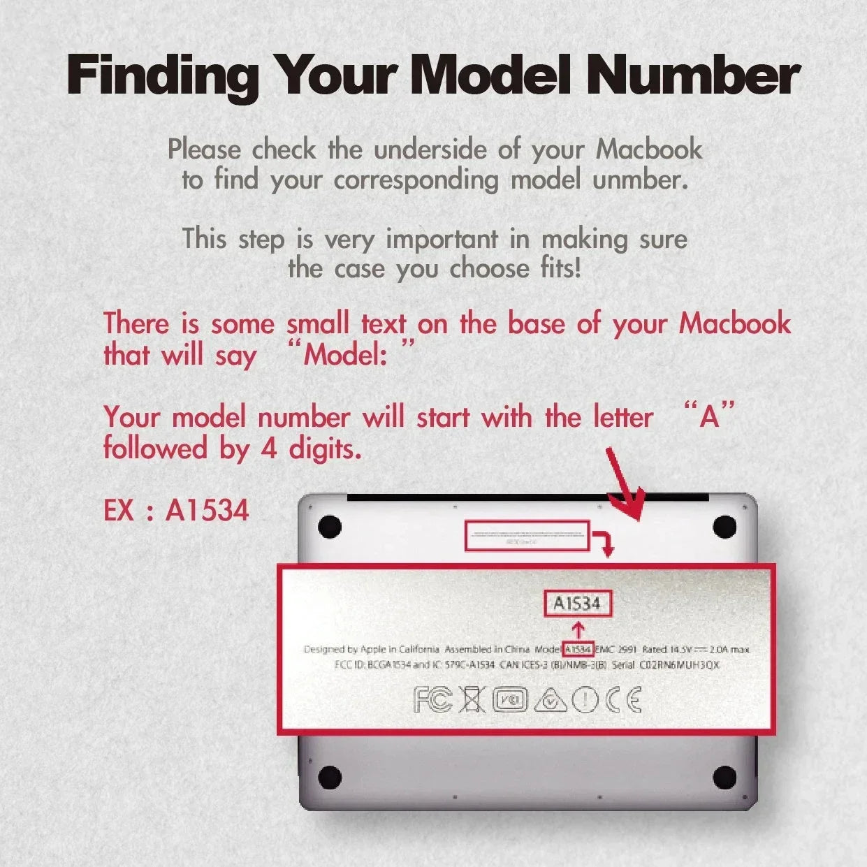 How to Find Your Model Number: To ensure a perfect fit, check the underside of your MacBook. You'll find a small text labeled "Model" with your model number starting with the letter "A" followed by 4 digits (e.g., A2337). This step is crucial for selecting the correct cover size.